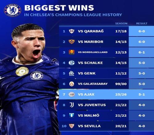 赛后来自德转的统计指出,切尔西本场比赛首发阵容的平均年龄为21.6岁,为近15个赛季欧冠单场比赛的第8年轻首发阵容,而5-1战胜阿贾克斯则是蓝军队史在欧冠比赛的第7大比分胜利。
